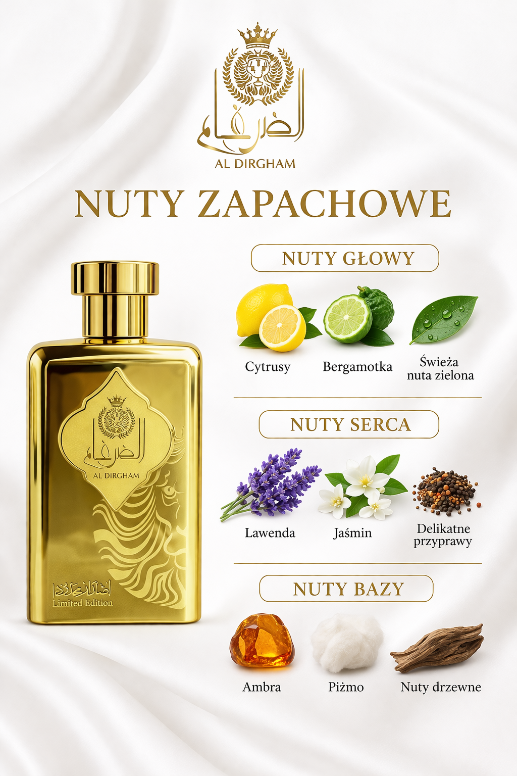 Al Dirgham to zapach, który od pierwszego kontaktu daje poczucie świeżości i czystości, ale z nutą luksusu. Otwiera się wyraźnymi cytrusami i bergamotką – świeżymi, lekkimi, bardzo energetycznymi. To ten moment, kiedy czujesz się zadbany, pewny siebie i gotowy na dzień.