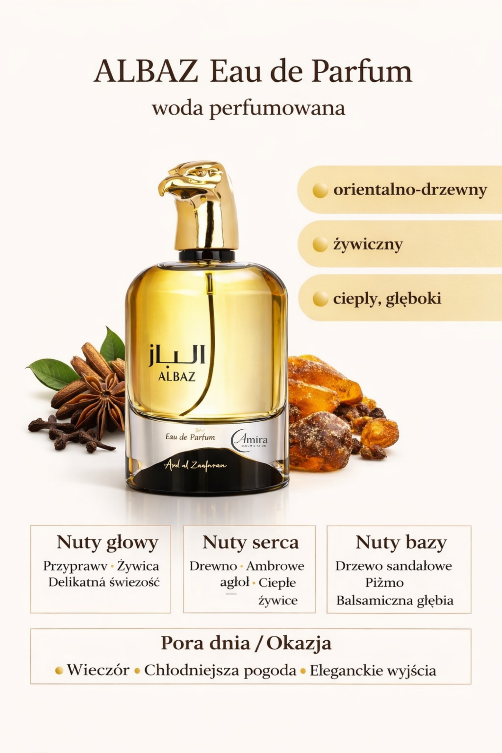 ALBAZ to zapach o głębokim, orientalnym charakterze, który od pierwszej chwili otula ciepłem i elegancją. Otwiera się nutami przypraw i żywic, przełamanych lekką świeżością, która nadaje mu wyważony i intrygujący początek.