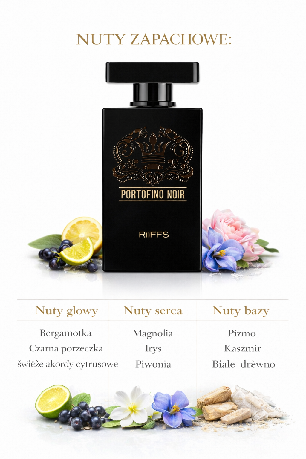 Portofino Noir to zapach, który od pierwszej chwili przyciąga świeżością i elegancją. Otwiera się wyraźną nutą cytrusową, przełamaną owocową głębią czarnej porzeczki, która nadaje mu energii i charakteru.