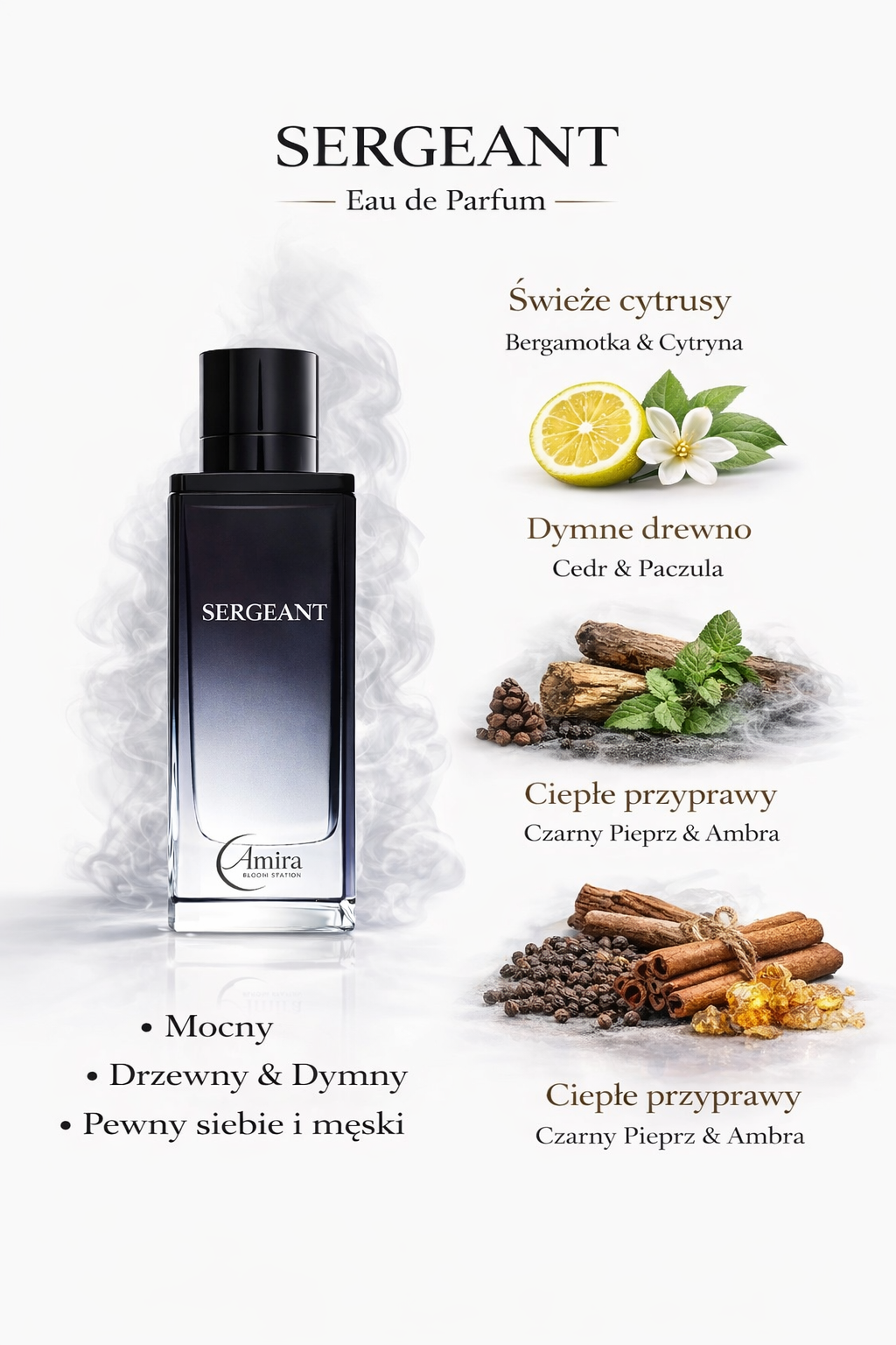 Sergeant to zapach, który od pierwszego momentu buduje wrażenie siły i charakteru. Otwiera się świeżą, energetyczną nutą bergamotki i cytryny, które nadają mu lekkości i nowoczesnego wyrazu.
